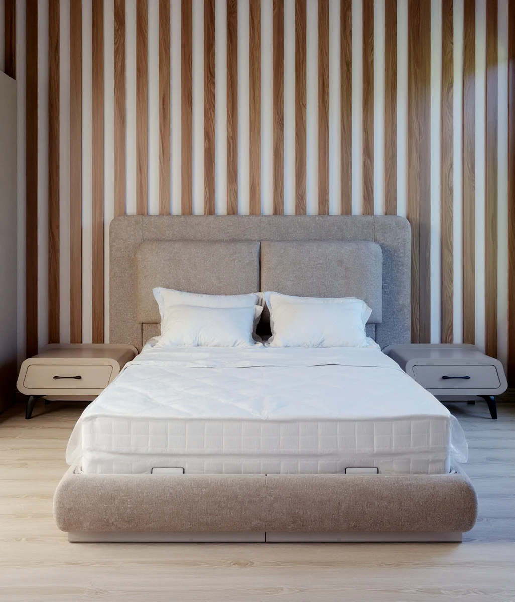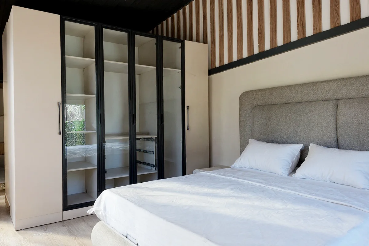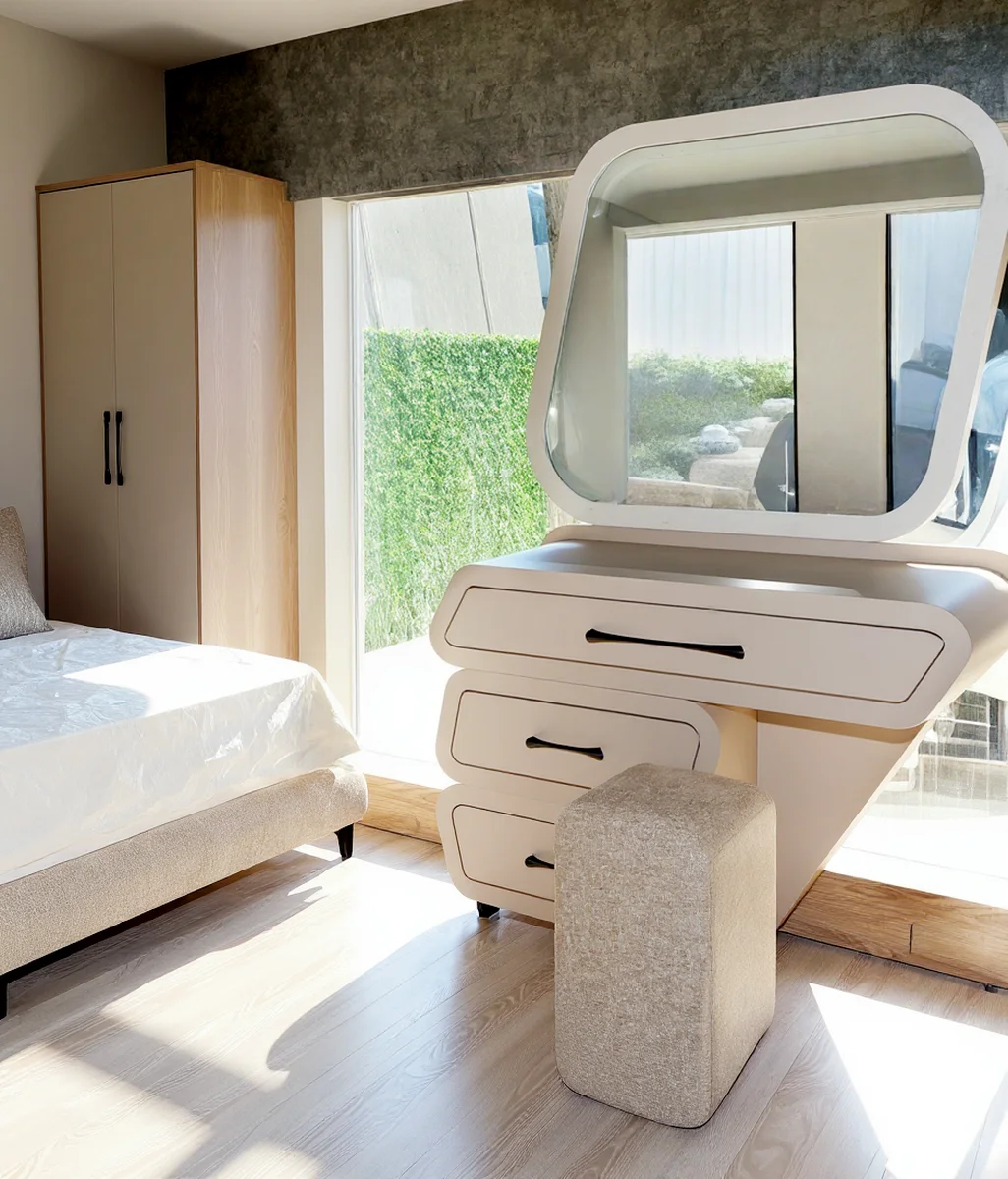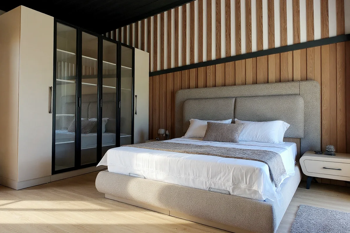Klas Yatak Odası Takımı’nın baza başlık kısmı, yumuşak dokusu ve zarif hatlarıyla huzurlu bir uyku alanı yaratırken, geniş gardırop ise cam detaylarıyla modern bir estetik sunar. Her ikisi de güvenilir malzemelerden üretilmiş, her detaya büyük bir özenle yaklaşılmış ve üstün kaliteli işçilikle tamamlanmıştır.